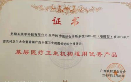 在此次大會(huì)上,蕪湖圣美孚科技有限公司生產(chǎn)的中醫(yī)綜合診斷系統(tǒng)SMF-Ⅲ(增強(qiáng)型)在2019年廣西農(nóng)村衛(wèi)生大會(huì)暨首屆廣西鄉(xiāng)鎮(zhèn)衛(wèi)生院院長論壇中被評(píng)為“基層醫(yī)療衛(wèi)生機(jī)構(gòu)適用產(chǎn)品”。